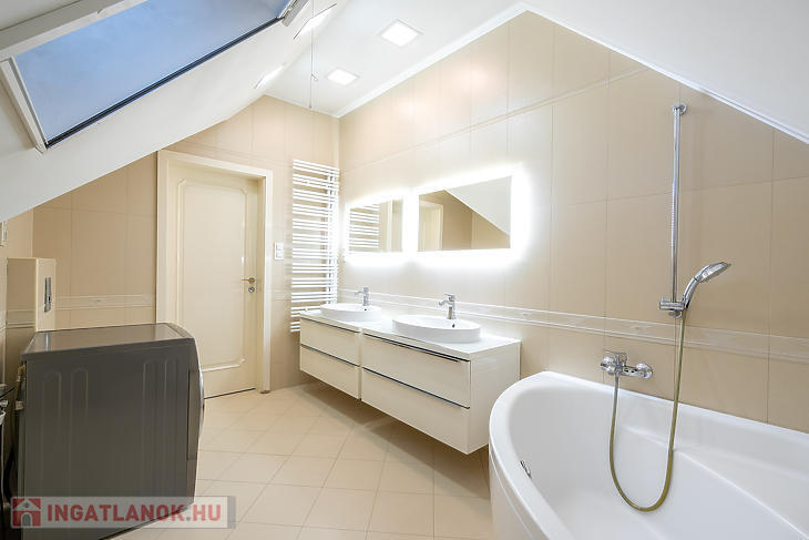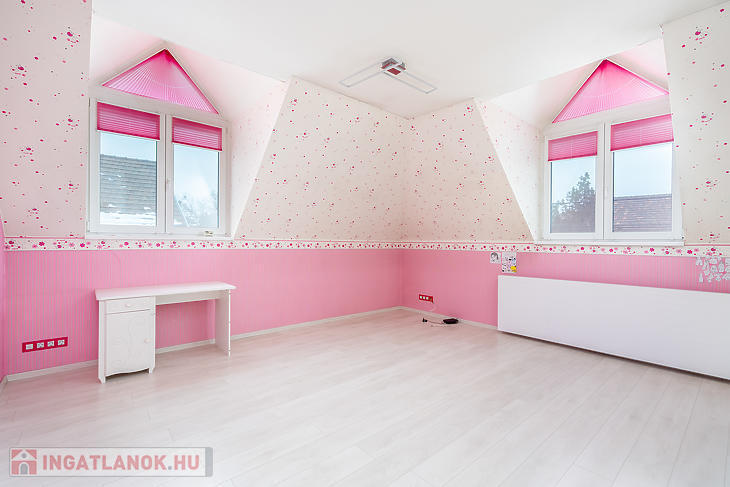 Az emeleti szinten 3 hálószoba, egy külön gardróbszoba, egy fürdőszoba, valamint egy külön WC kapott helyet. Az ingatlan összesen 7 szobával rendelkezik, így nagyobb család vagy többfunkciós használat esetén is kiváló választás.