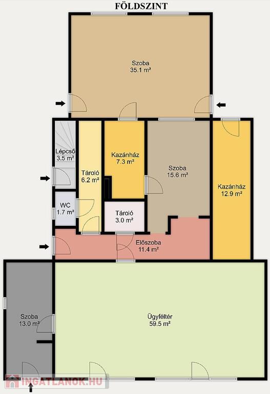 A lakó- és üzleti funkciók teljes mértékben szeparálhatók, ritka rugalmasságot biztosítva. A földszinten kialakításra került egy 60 m²-es utcai bejáratú ügyféltér + több helyiség amely ideálisan alkalmas vállalkozás, iroda vagy rendelő céljára.
