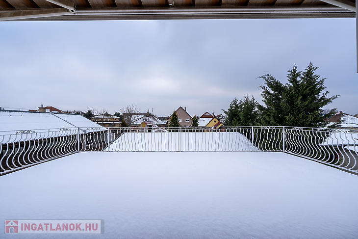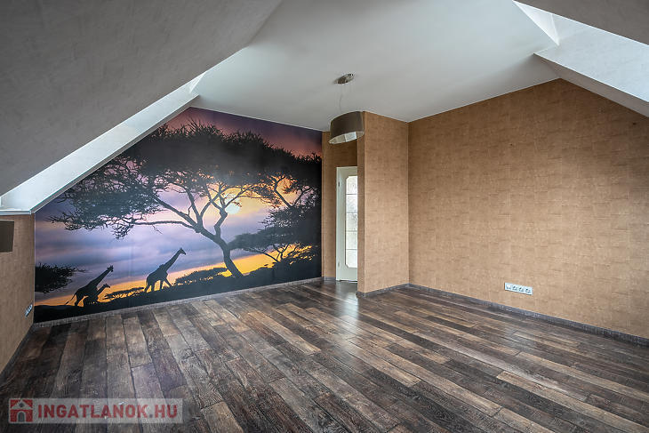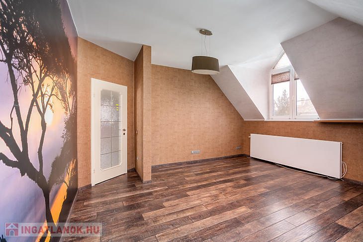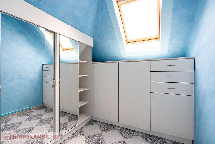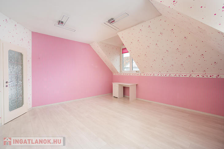 Az emeleti szinten 3 hálószoba, egy külön gardróbszoba, egy fürdőszoba, valamint egy külön WC kapott helyet. Az ingatlan összesen 7 szobával rendelkezik, így nagyobb család vagy többfunkciós használat esetén is kiváló választás.