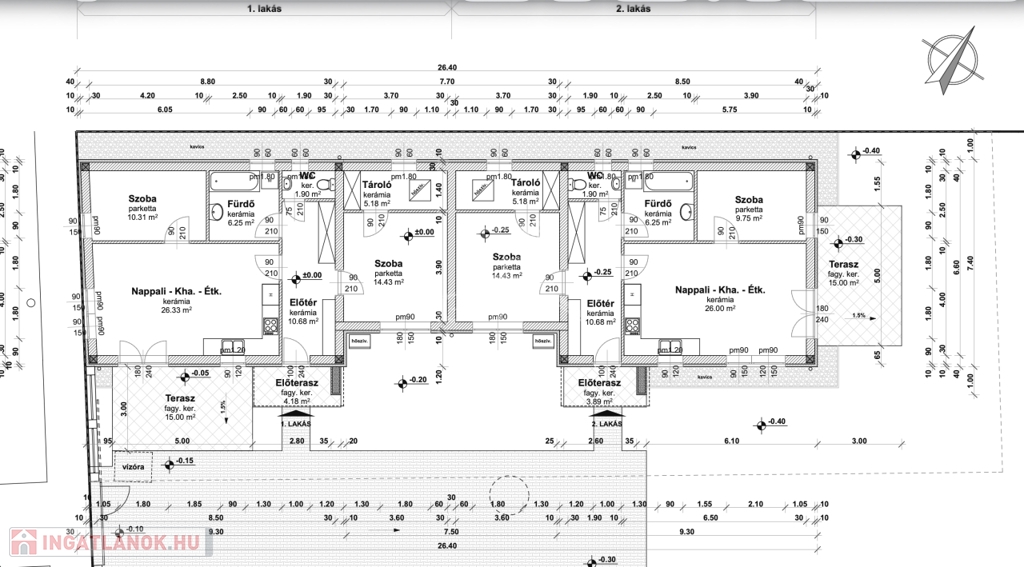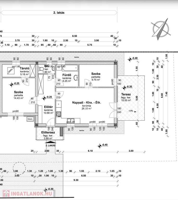 -előszoba(10,68m2), amerikai konyha nappali(26m2), 2 szoba(9,75m2, 14,43m2), fürdőszoba(6,25m2), WC(1,9m2), tároló(5,18m2), valamint 15 m2 és 3,89 m2-es terasz.