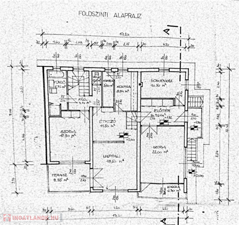 - Földszint: előtér-szoba (17,9 m2), nappali (30 m2), konyha (5,76m2), WC (1,2m2), fürdőszoba (12,4m2), közlekedő (7,6m2), 2 szoba(10,5m2; 22m2), terasz ( kb.40m2).