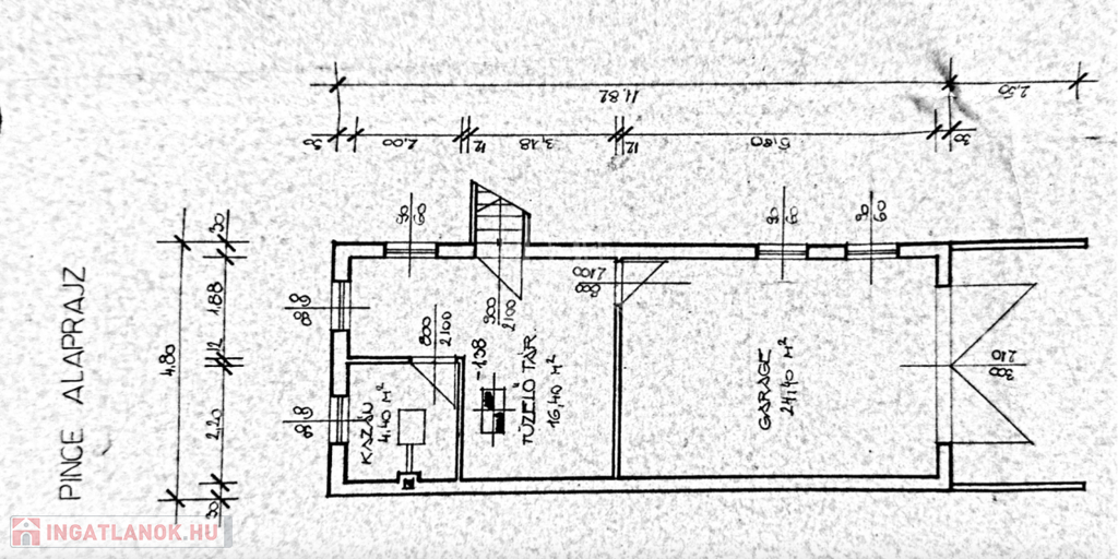 - Pince: tároló (24,4m2), tároló (16,4m2), kazánház (4,4m2), dupla garázs (40m2).