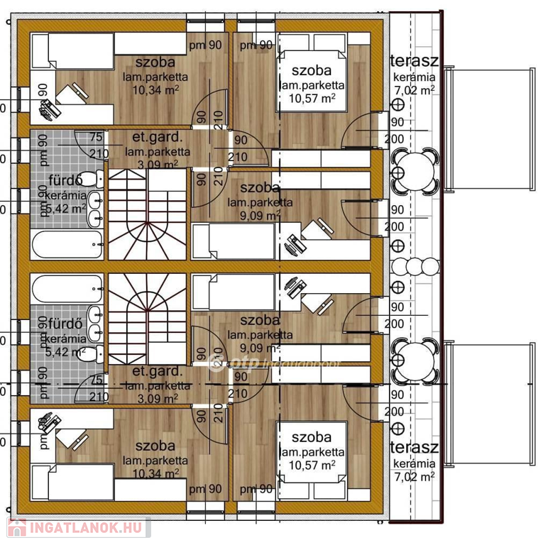Az építkezés minőségi kivitelezéssel épül, a lakások nettó 84,45 m2 + teraszok (9,7 m2 + 7 m2) területtel rendelkeznek és kb. 300 m2 telekterület tartozik hozzájuk, a házak egymás mellett helyezkednek el, külön kocsibeállóval.