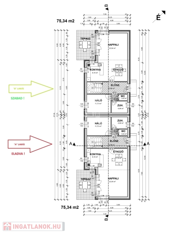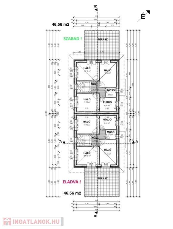 A ház felépítése: földszint + teljes értékű emelet, az eladásra kínált ingatlan a hátsó ikerházfél azaz a : " B LAKÁS" !