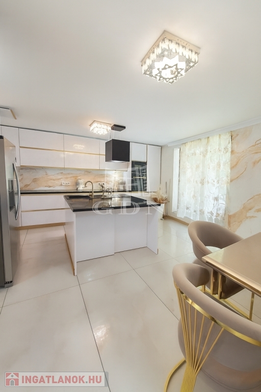 A házba belépve egy tágas nappaliba érkezünk, innen tovább haladva található egy étkezős - konyha, beépített modern konyhabútorral.