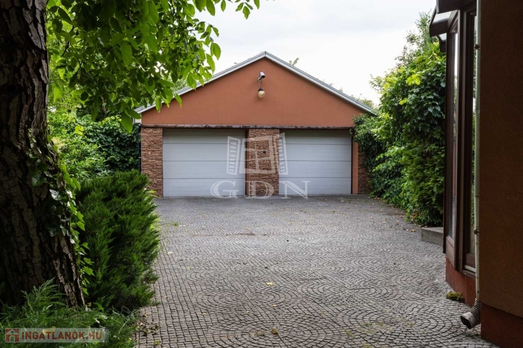 Parkolás két beállásos széles, szerelő aknás saját különálló garázsban, telken belül és a ház előtt is kényelemesen megoldható.