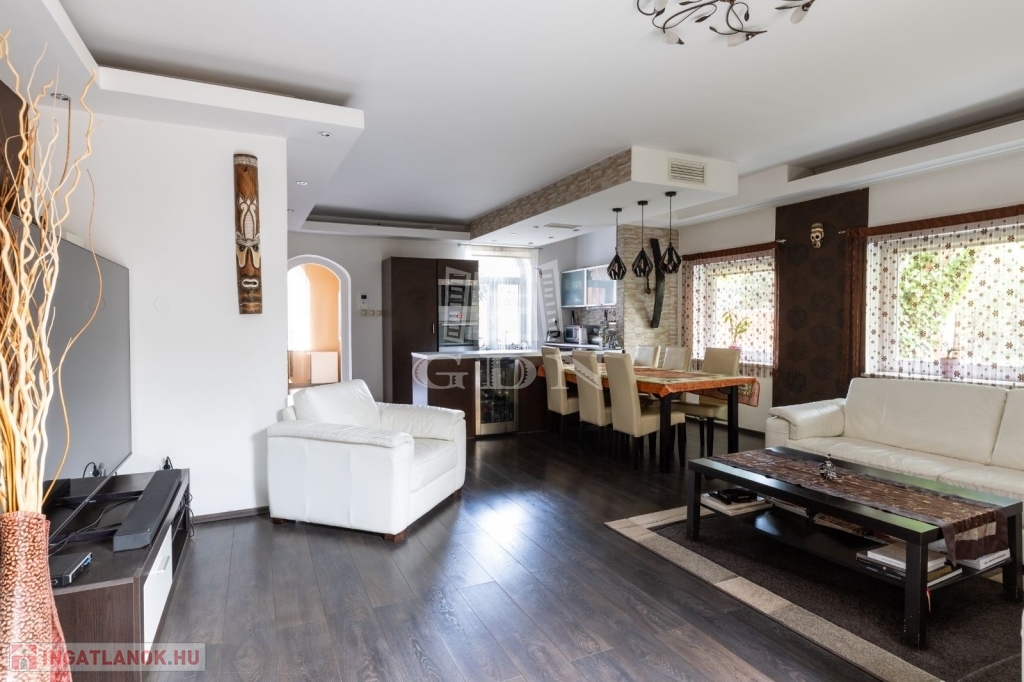 A ház alapterülete bruttó 220 nm. Elosztása 5+2 félszoba. Alsó szinten található 1 amerikai konyhás nappali, külön konyha, még egy nappali, két db mosdó. 28 nm-es beépített terasz.