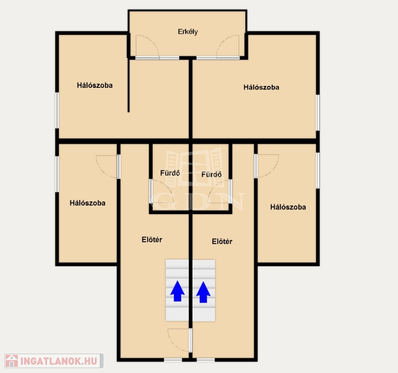 Felső szinten 3db hálószoba + 2 félszoba található, és 2 teljes értékű fürdőszoba.