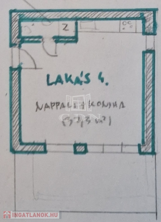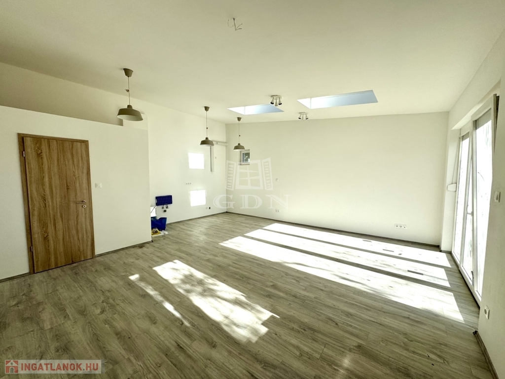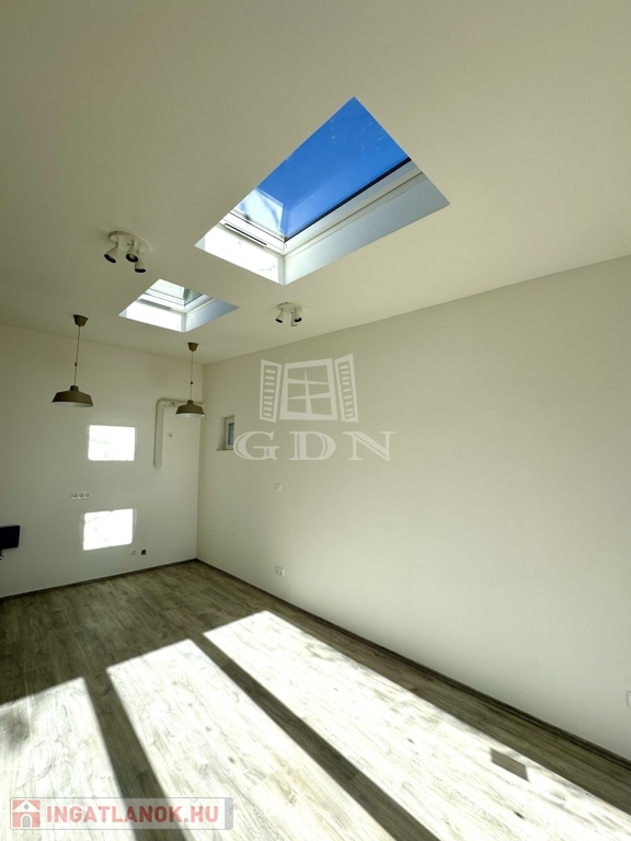 Jelenleg egy tágas, 37 nm-es, amerikai konyhás nappaliból áll, amelyet két különleges felülvilágító ablak tesz egész nap világossá.