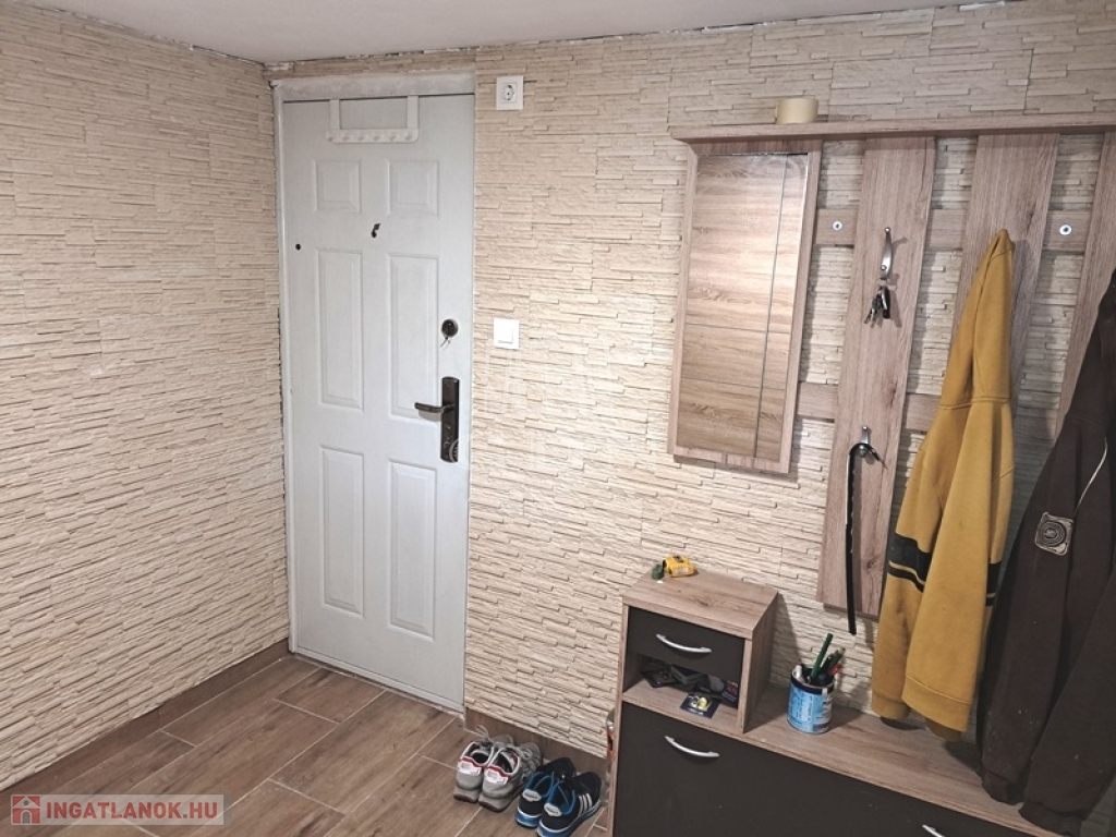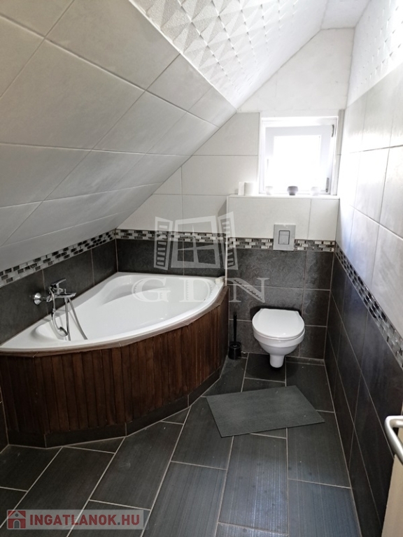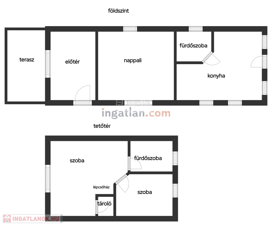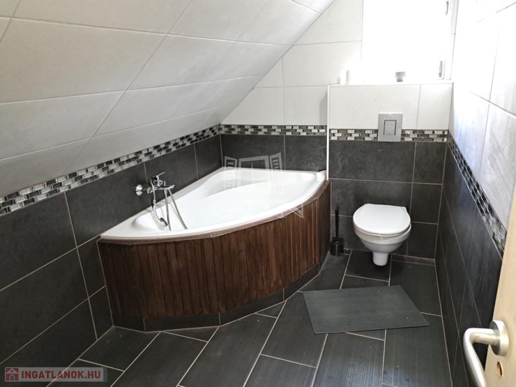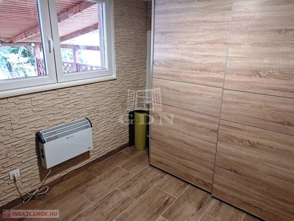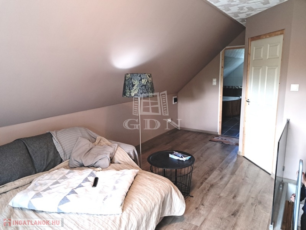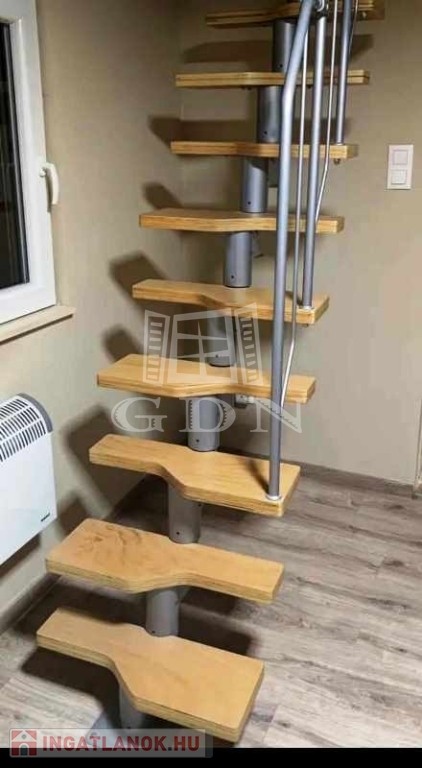 Helyiségei:alsó szint, előtér, nappali, konyha/étkező, fürdőszoba zuhannyal, fedett terasz, felső szint, 2 szoba, fürdőszoba, tároló.