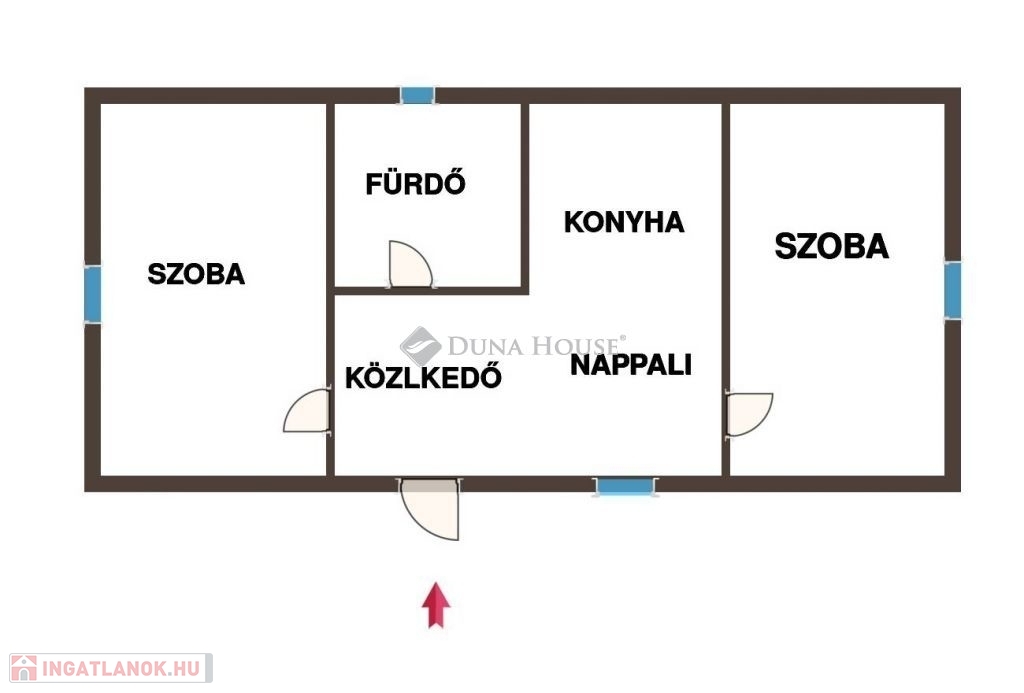 Kialakítása: 2 szoba, fürdő+wc, étkező+konyha, közlekedő.