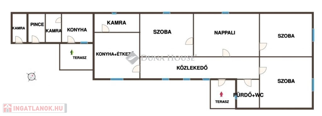 Kialakítása : 3 tágas külön nyíló szoba, nappali, közlekedő, fürdő+wc, konyha+étkező, kamra. További nyári konyha, kamra, tároló és pince a fő épület után.