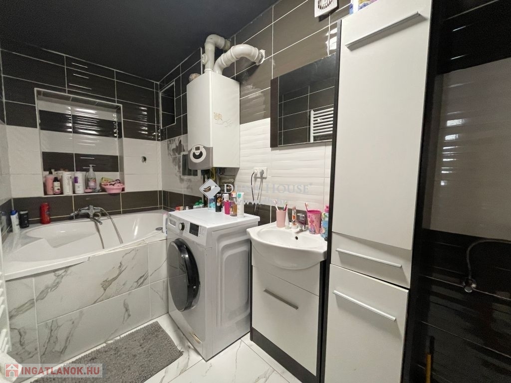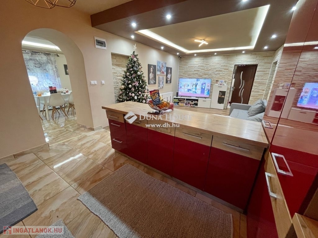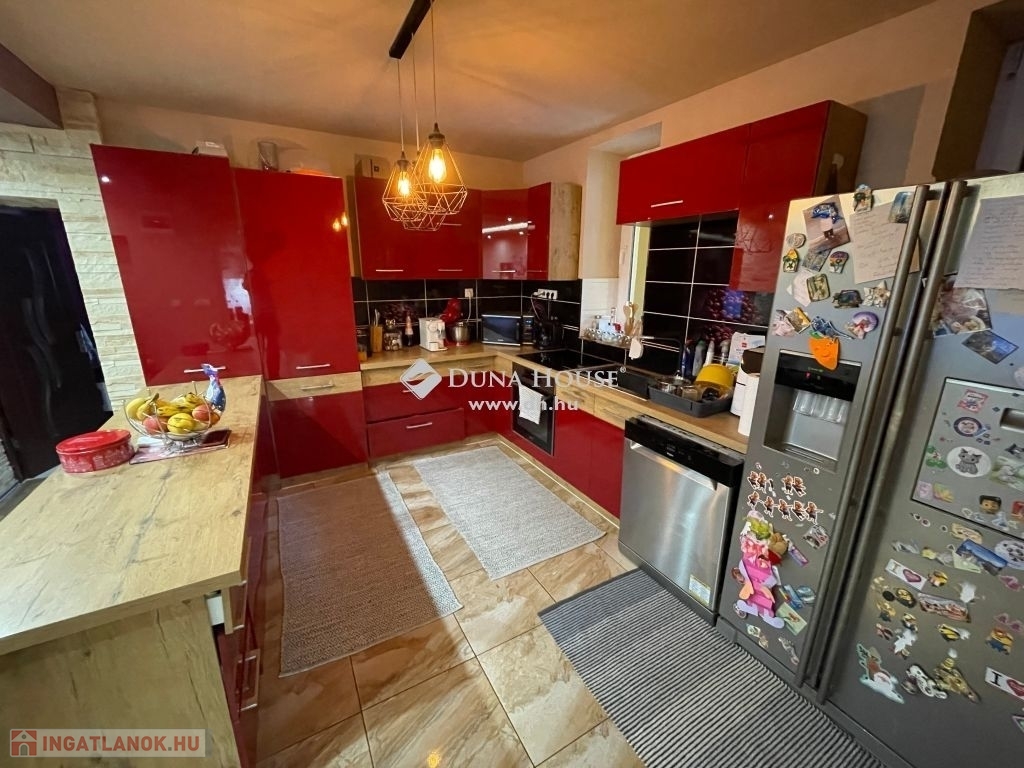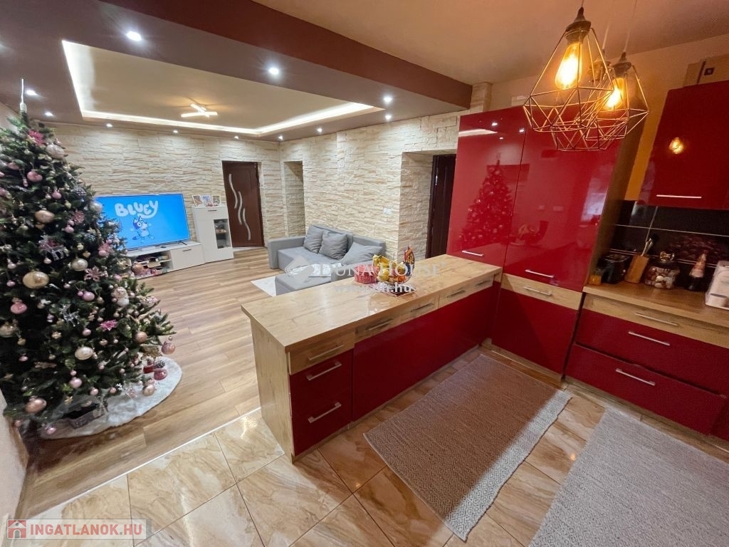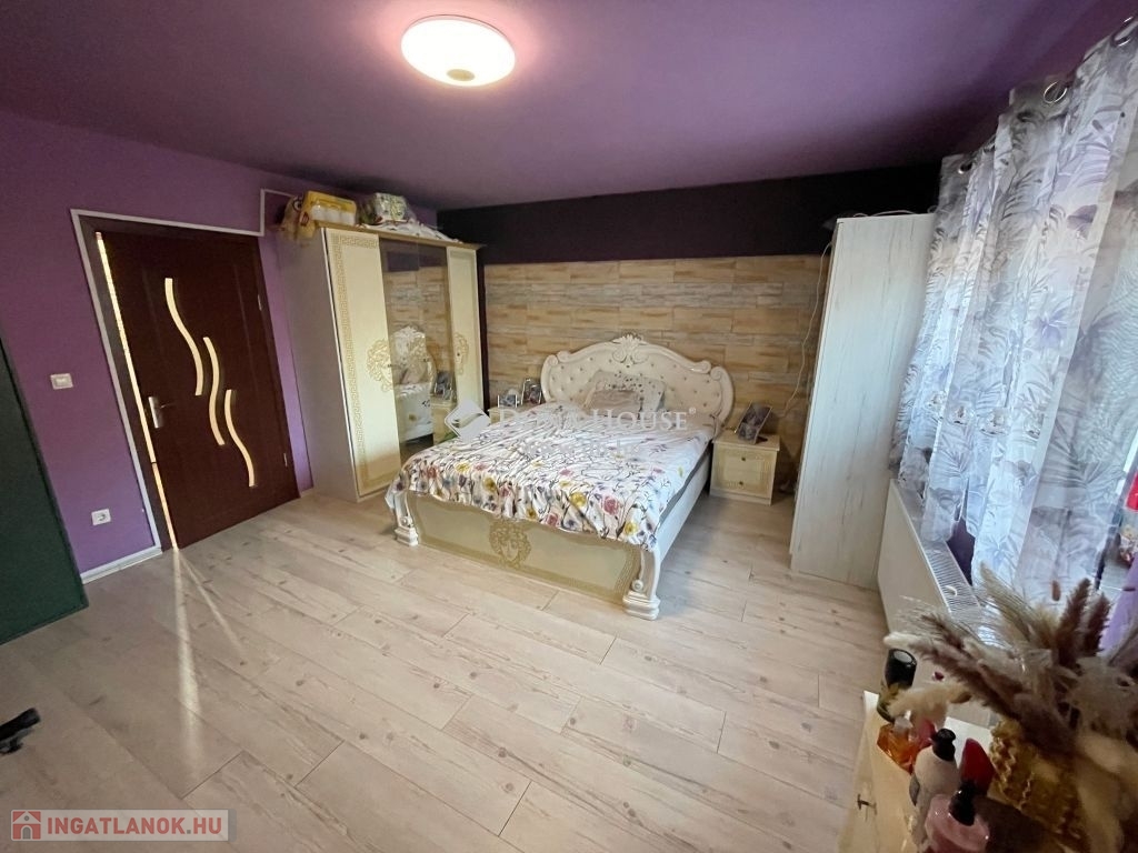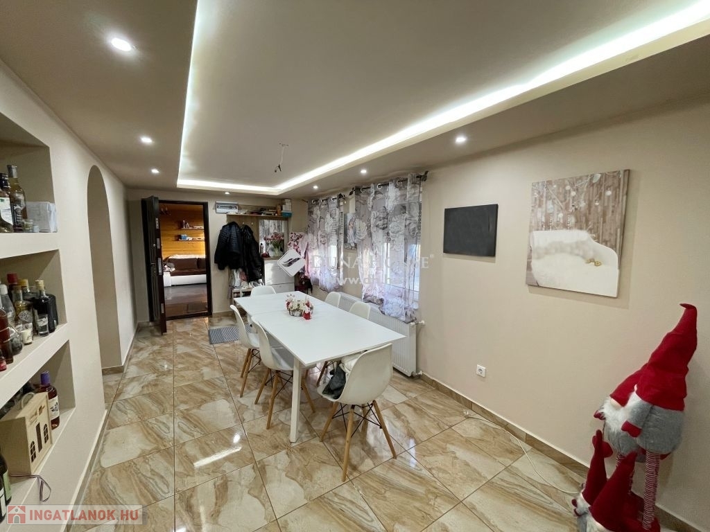 A házba egy tágas előtéren keresztül jutunk be, innen nyílik az étkező, majd az amerikai konyhás nappali. Két nagyobb és egy kisebb hálószoba, valamint egy fürdőszoba van még a beltérben kialakítva. A fűtött lakótér 130 m2. 2020-ban egy nagyobb felújítás során lett kiépítve a gázfűtés, cserélve lettek a víz- és villanyvezetékek, megújultak a szaniterek és burkolatok, valamint a gépesített konyha. Ezen kívül szigetelve is lett a ház. A nyílászárók és a tető egy korábbi felújítás során lettek cserélve. Alternatív fűtésnek egy vegyes tüzelésű kazán is rendelkezésre áll. Az utcafront felől, kétállásos fedett gépkocsi beálló biztosítja a parkolást (32 m2).