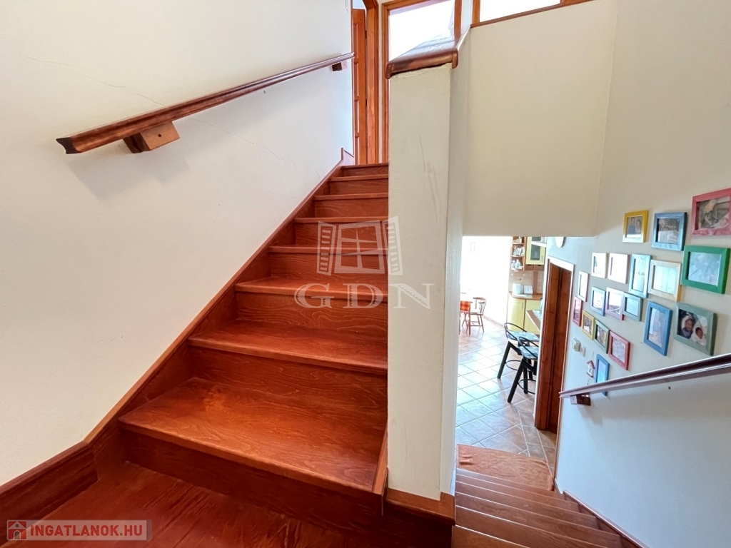 - Tetőtér: Egy tágas falépcső vezet az emeletre, amely tetőtér: egy kisebb előtérről nyílik a 3 szoba, hatalmas fürdőszoba sarokkáddal, WC, bidé.
