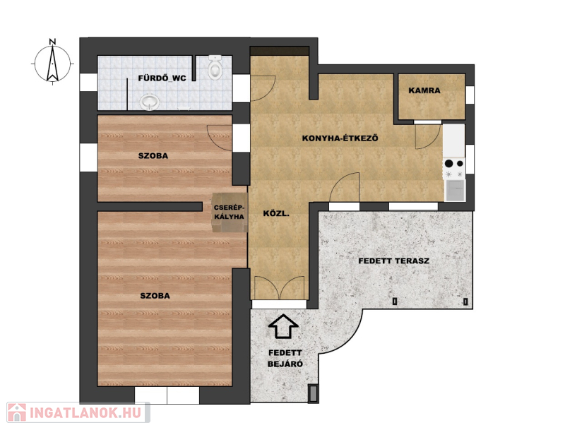 Szobákban laminált parketta, többi helyiségben járólap a padlóburkolat.