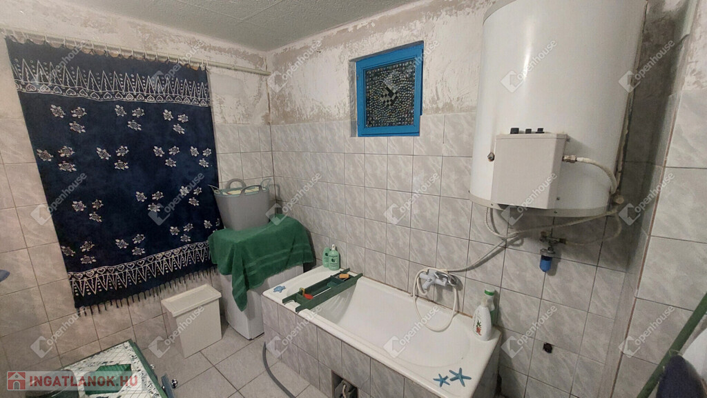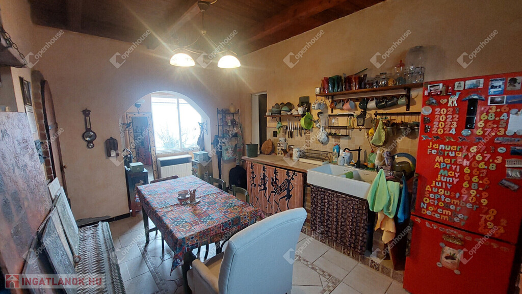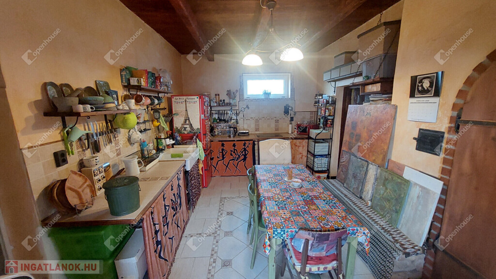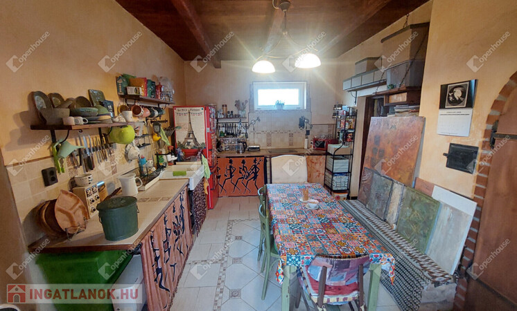 A konyha egyedi hangulatát a téglából épített, rusztikus jellegű konyhabútor-alap adja. A beépített sütő és főzőlap a vételár részét képezi, valamint a stílusban hozzá illő csaptelep és mosogató is beépítésre került. A melegvizet gázbojler biztosítja. A fürdőszoba nagyméretű káddal felszerelt.