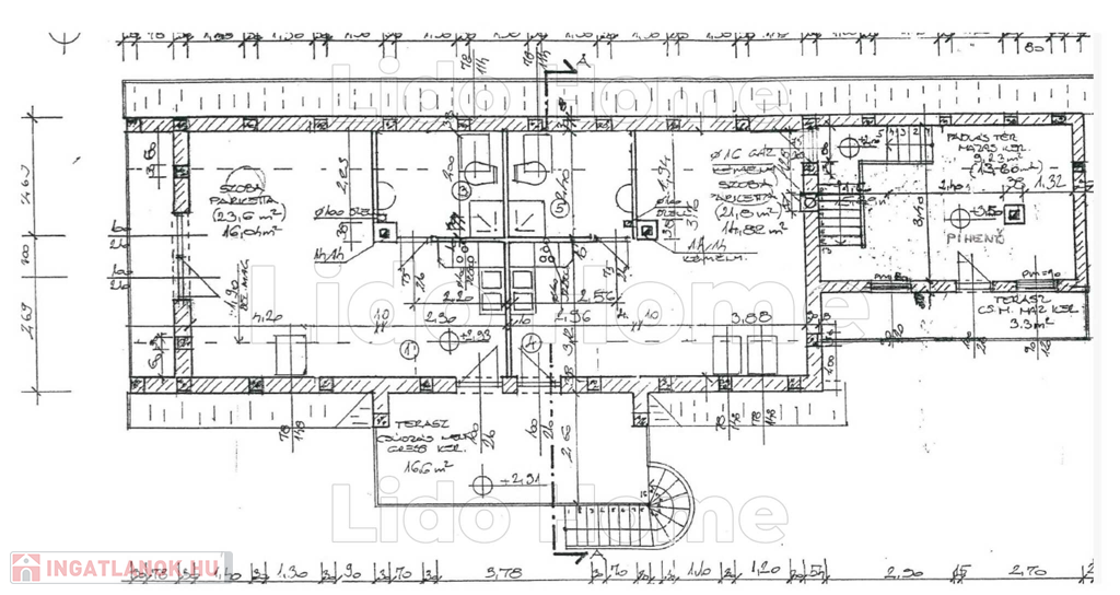 - tetőtér: előtér, konyha-étkező, fürdőszoba zuhanyzóval + WC, szoba, erkély