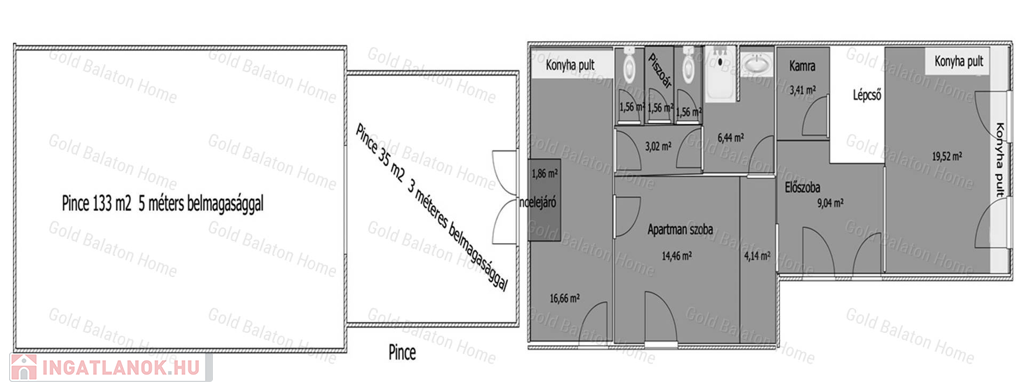 - a ház mellett boltíves pince található 2 helyiséggel, az egyik 133 nm-es 5 nm belmagassággal, amely egy 3 m belmagasságú 35 nm-es pincén keresztül közelíthető meg