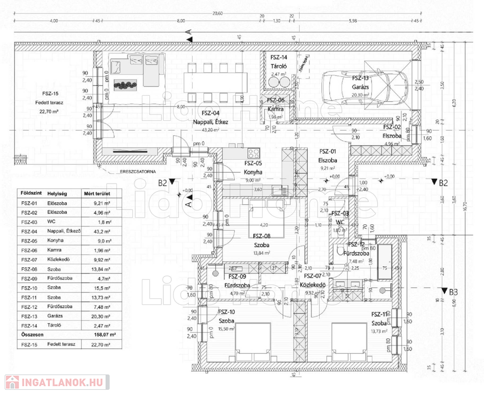 - A 169 m2-es családi ház helyiségei: nappali étkezővel 43,2 m2, konyha 9 m2, szoba 15,5 m2, szoba 13,84 m2, szoba 13,73 m2, fürdőszoba 7,48 m2, fürdőszoba 4,7 m2, WC 1,8 m2, kamra 1,96 m2, előszoba 9,21 m2, előszoba 4,96 m2, közlekedő 9,92 m2, tároló 2,47 m2, garázs 20,3 m2, fedett terasz 22,7 m2.