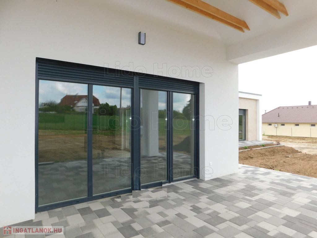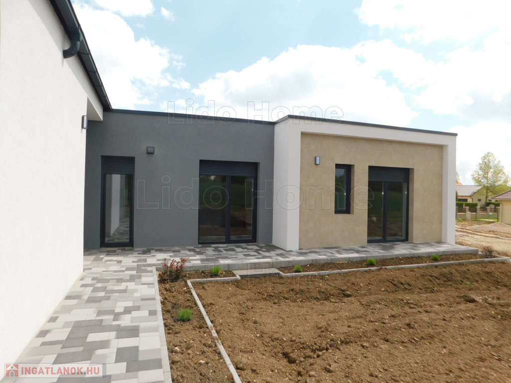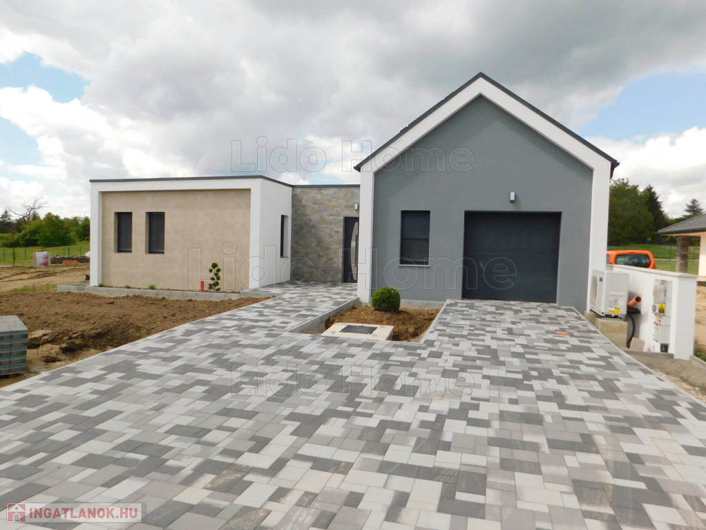 Egyszintes, három hálószobával, nappali étkezővel, konyhával, kettő fürdőszobával, külön WC-vel, közlekedőkkel, fedett terasszal, garázzsal épülő családi ház eladó.