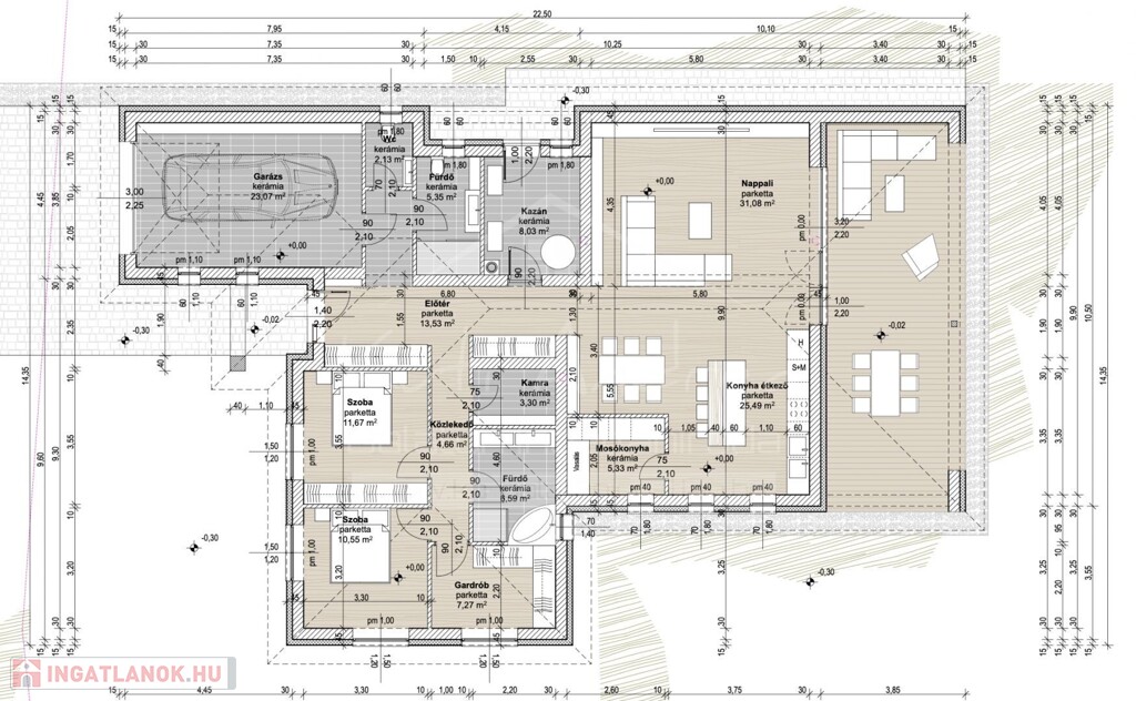 • A lakóház mérete nettó 159 m2 garázzsal együtt.