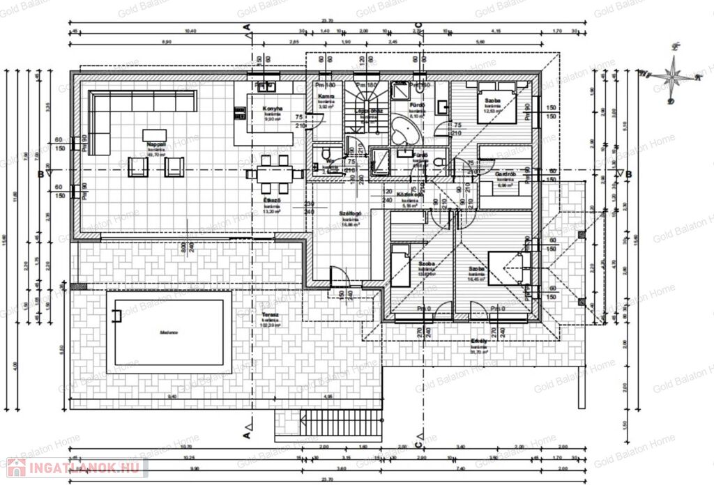 - földszint: szélfogó, nagy nappali, konyha, kamra, étkező, közlekedő, 2 fürdőszoba + WC, külön WC, 3 hálószoba, 1 gardrób, nagy erkély, nagy terasz és medence