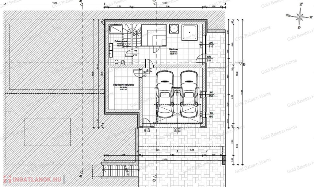 - utca szint: duplagarázs, gépészeti helyiség, Wellness részleg, fürdőszoba