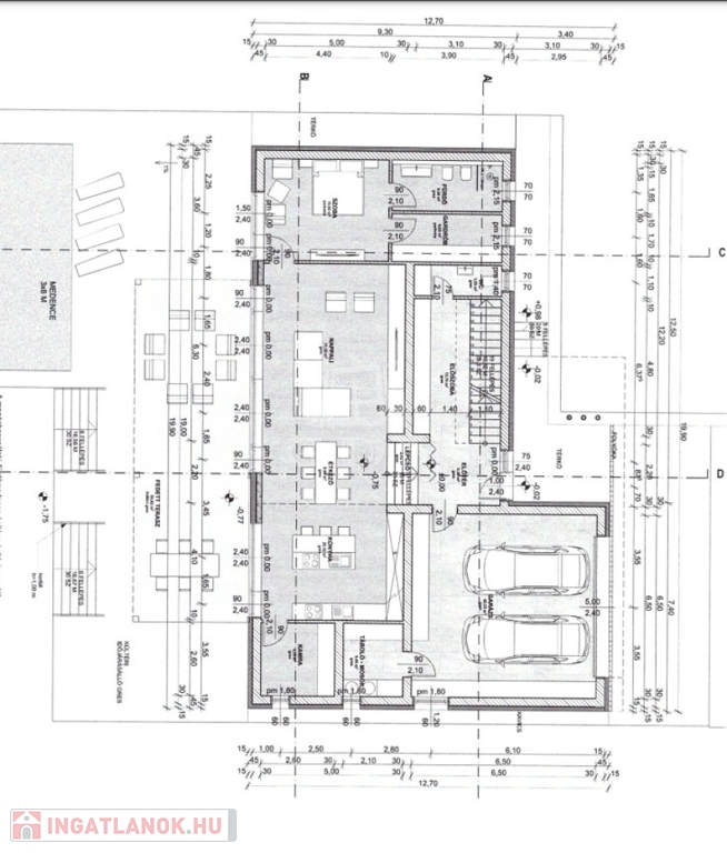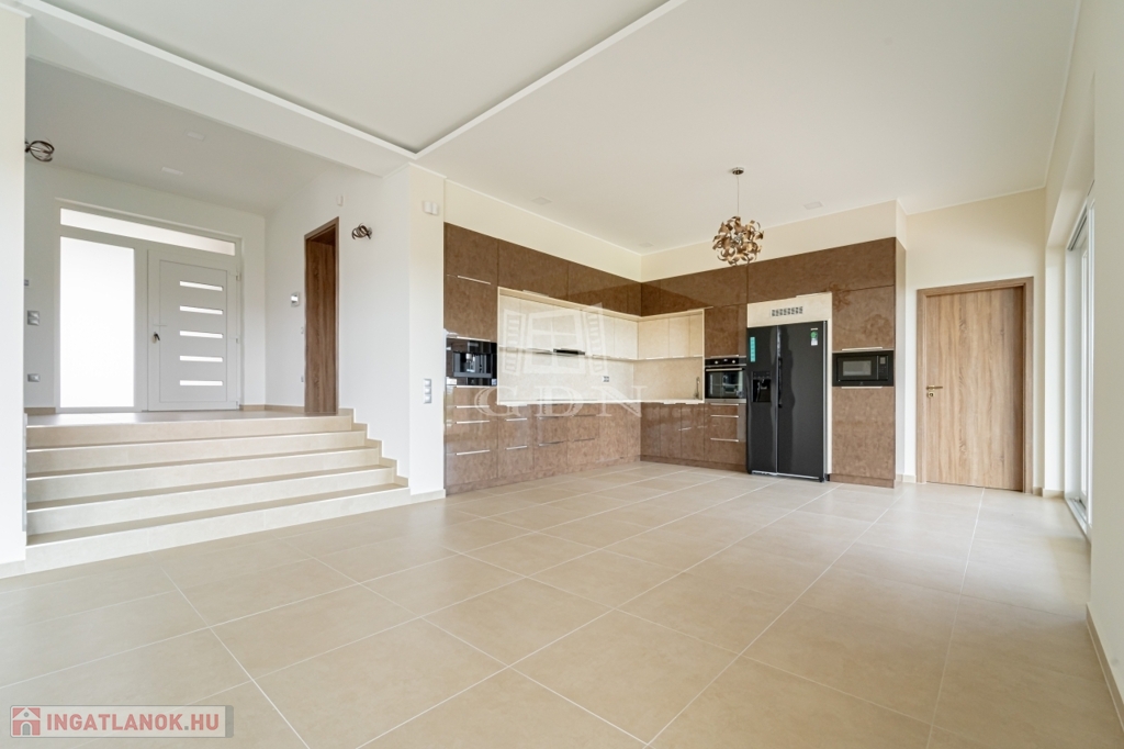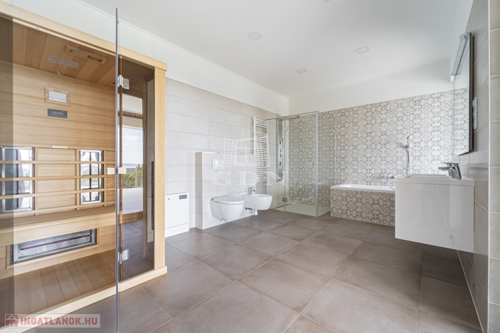 A földszint 170 nm ahol egy hatalmas egylégteres nappali-konyha-étkező, galériás előszoba, főháló gardróbszobával saját fürdő és wc-vel, háztartási helyiség, vendég wc, gépház, 2 beállásos garázs és az 50 nm-es pergolával fedett terasz találhatók. A teraszon található 3,5x6m-es MEDENCE és panorámás üveg falú FINN SZAUNA fokozza a valódi luxus érzést, ami a ház minden apró részletében megmutatkozik.
