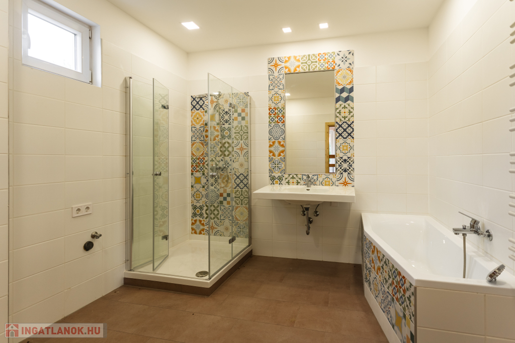 A földszinten tágas nappali–konyha kialakítás, egy hálószoba, valamint egy korszerű gépészeti helyiség található. A modern fürdőszoba káddal, zuhanyzóval és mellékhelyiséggel felszerelt.
