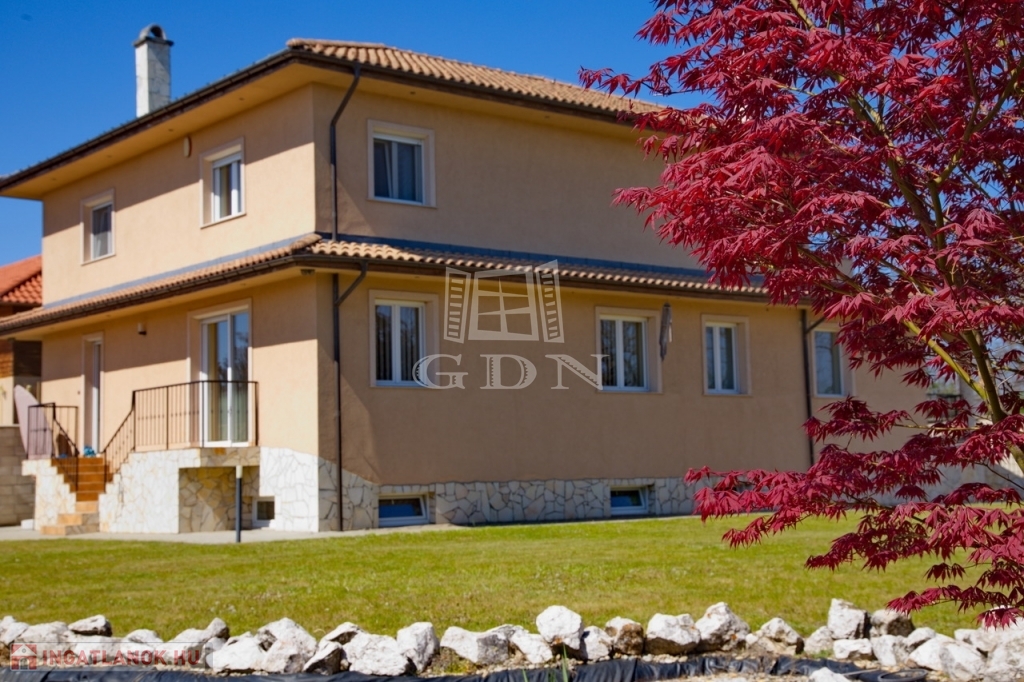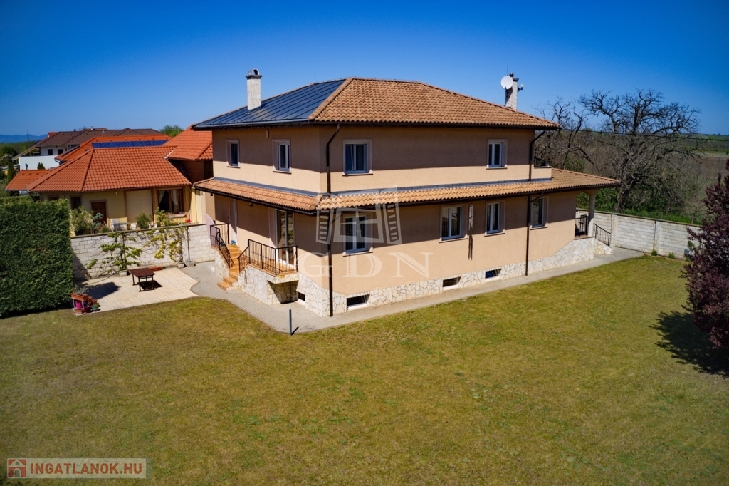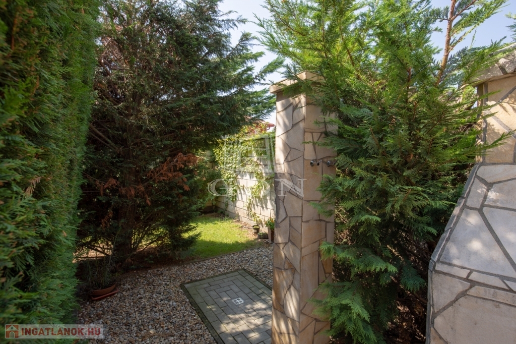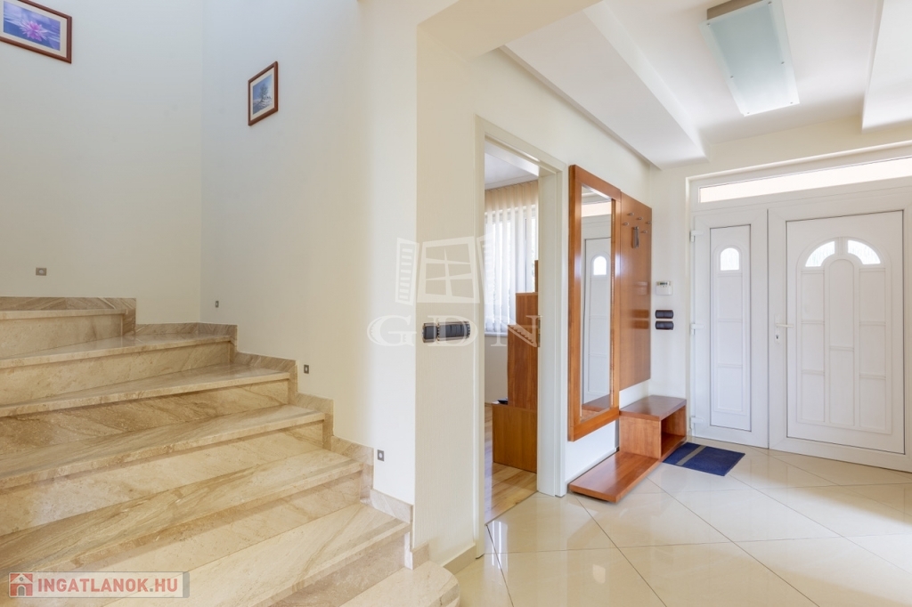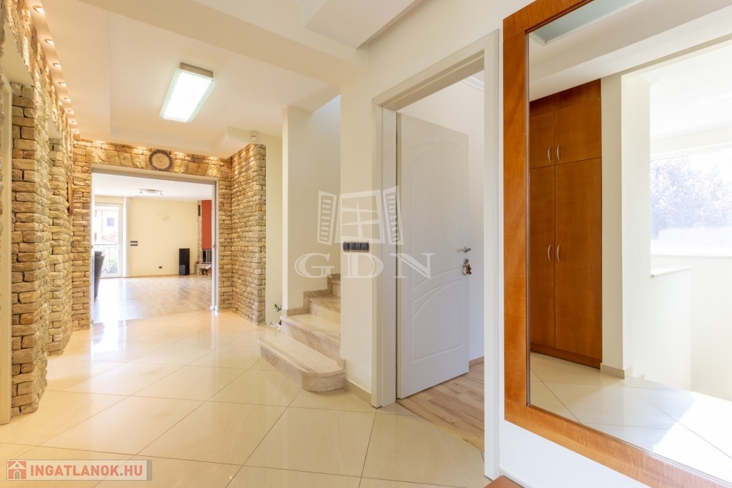 A ház dupla telekre épült 1309 nm-es így a 3 szintes 364 nm-es 5+1 félszobás 2 gardrób szobás ingatlan mellett bőven maradt hely a gondozott parkosított kertnek.