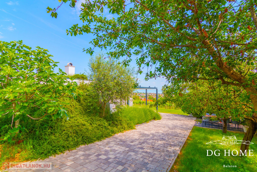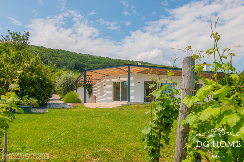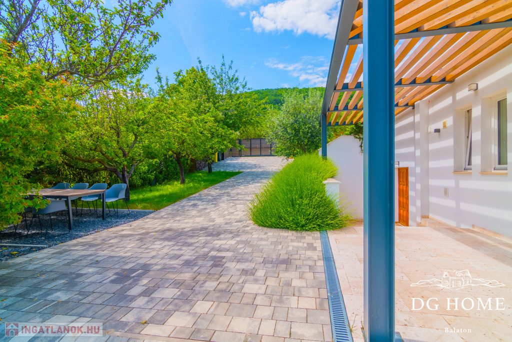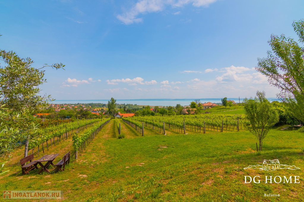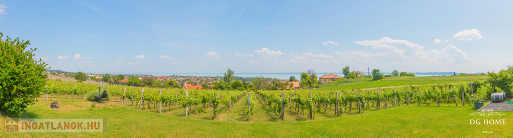 Eladó Csopakon egy 2018-ban épült, 165 m²-es, elegáns újszerű családi ház, páratlan balatoni panorámával, amely minden évszakban lenyűgöző látványt nyújt. Az ingatlan egy 3096 m²-es telken helyezkedik el, melyet gondosan művelt, minősített olaszrizling szőlő ölel körül.