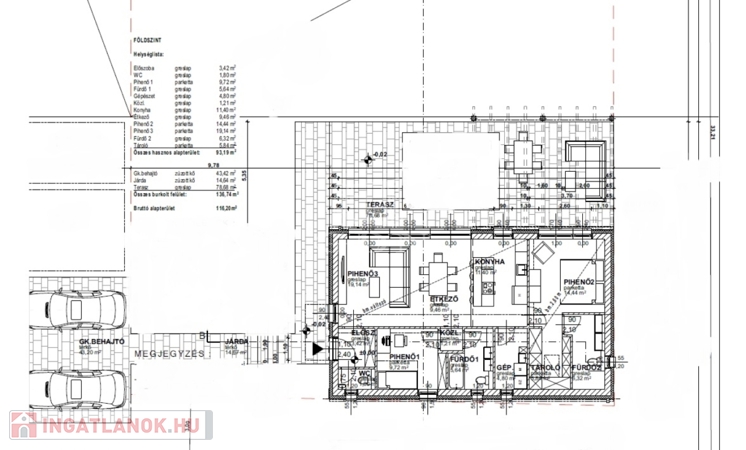 A 2025-ben épült ingatlan 93 négyzetméter hasznos alapterülettel rendelkezik, mely ideális elrendezést biztosít: egy körbe napozott amerikai konyha-nappali mellett két tágas hálószoba, két különálló fürdőszoba, előszoba és háztartási helyiség került kialakításra. A belső tér rugalmasan alakítható, így igény szerint akár nappali + 3 szobás elrendezés is megvalósítható. Az életteret jelentősen kiterjeszti a házhoz kapcsolódó 79 négyzetméteres terasz.