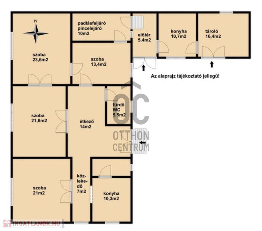 A 163 nm alapterületű, jó állapotú családi ház helyiségei: 4 szoba, 1 fürdőszoba-WC, 2 konyha, előszoba, tároló, étkező, padlásfeljáró-pincelejáró.