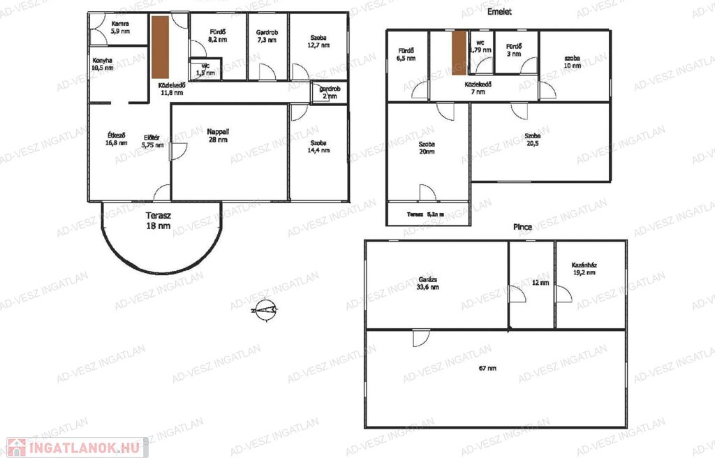 Pince 132m2, földszint 126m2, tetőtér 69m2, garázs 36m2.
