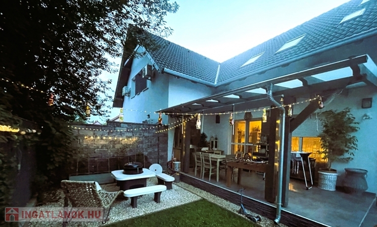 Az ingatlanhoz két terasz tartozik (16,43 m² és 4,4 m²), melyek ideálisak pihenésre. A parkosított udvaron elszeparált kerti grillező kapott helyet, valamint egy 15 m²-es műhely is megtalálható külön bejáratú tárolóval, amely ideális hely a hobbi vagy tárolási igények kielégítésére.