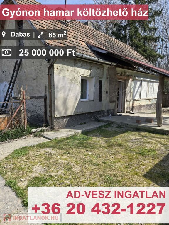 Eladó Dabas-Gyón csendes, családi házas övezetében egy felújítandó ingatlan, mely ideális lehetőséget kínál saját ízlés szerint történő átalakításra. Az ingatlan alapterülete 65m2, míg a telek mérete 1311m2, így bőséges teret biztosít a kertészkedéshez, vagy akár bővítési lehetőségekhez is.