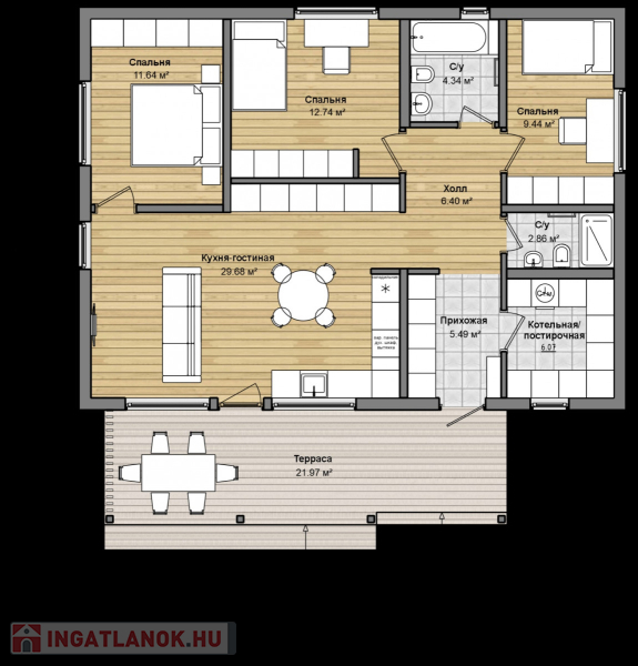 A ház belső elosztása: 3 hálószoba, amerikai konyhás nappali, 2 fürdőszoba, tároló + 21 cm terasz.