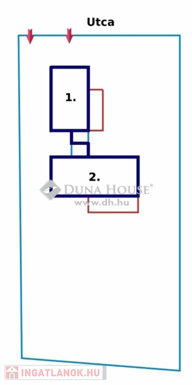 Az 1. ház utcafronti, 480 nm-es saját használatú, kőrbe kerített telken helyezkedik el.