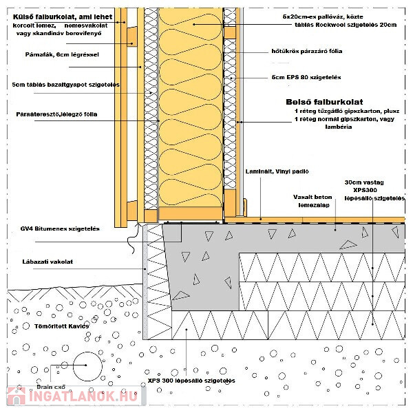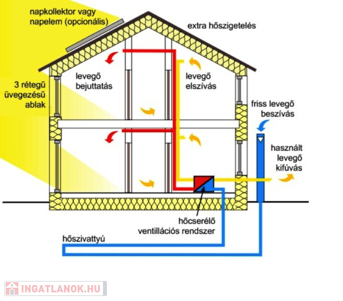 Passzív ház az, amelynek fűtési igénye egytizede a normál lakóházaknak. Kiváló hőszigetelés: A+++, ami azt jelenti, hogy az alapban 30 cm vastag XPS 300 az aljzatbeton alatt, a 20 cm vázszerkezetben kívül és belül is 2X5 cm táblás bazaltgyapot szigetelés, illetve minimum 5 cm kiszellőztetett légrés a főfalakban és a tetőszerkezeben is.