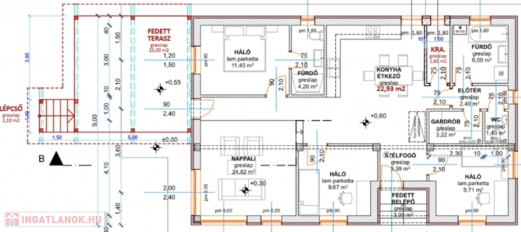 Alapterület és Elosztás (102 m²): Az ingatlan kiváló beosztással rendelkezik: 3 hálószoba, külön gardróbszoba, tágas, gépesített konyha-étkező, kamra, valamint egy egyedi tervezésű, süllyesztett nappali biztosítja a kényelmes életteret.