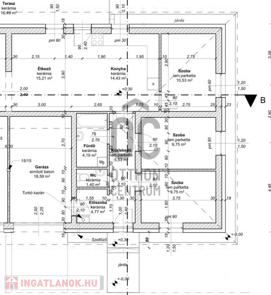 -beton alapon, tégla falazat 15 cm-es szigetelés, cserép héjazat