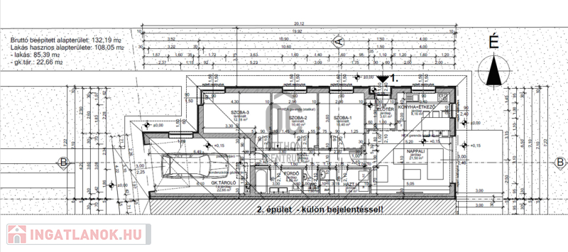 Az ingatlan beépített területe : 108 m2 + egy : 15 m2 - es terasz tartozik hozzá.