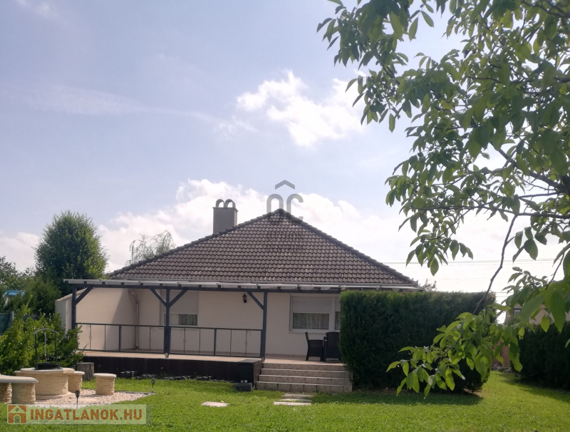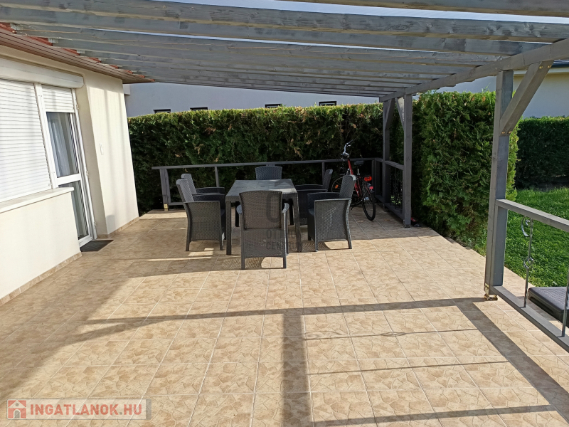 A nappaliból a 61 m2-es fedett teraszra jutunk, ahol nagyobb családi-baráti rendezvények is gond nélkül megrendezhetők. A kertben diófa, örökzöldek, kerti sütő segíti a relaxációt. A vízóra mellé öntözésre használt almérő került kiépítésre, ezért a csatornadíjat nem kell megfizetni ennek használata során. A parkosított kertben egy kerti tároló is helyet foglal, emellett egy fedett kocsibeálló is újonnan került létesítésre.