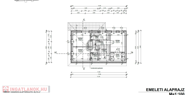 Emelet helyiségei : 3 szoba, fürdő, háztartási helyiség + az egyik szobához gardrob szoba.