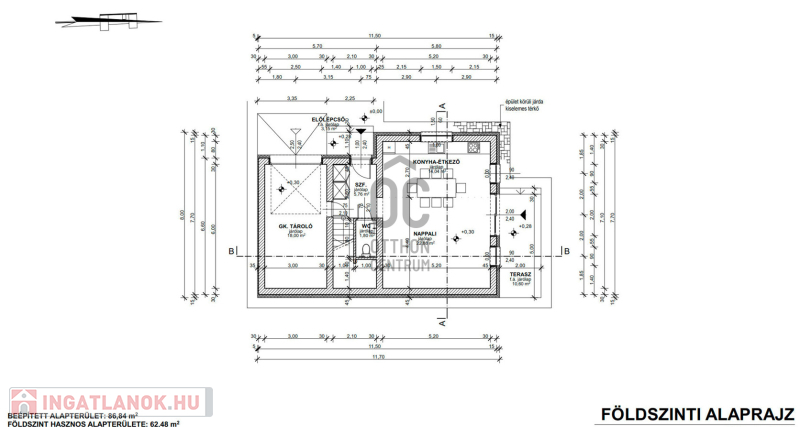 Földszint helyiségei : konyha - étkező - nappali, + terasz + garázs