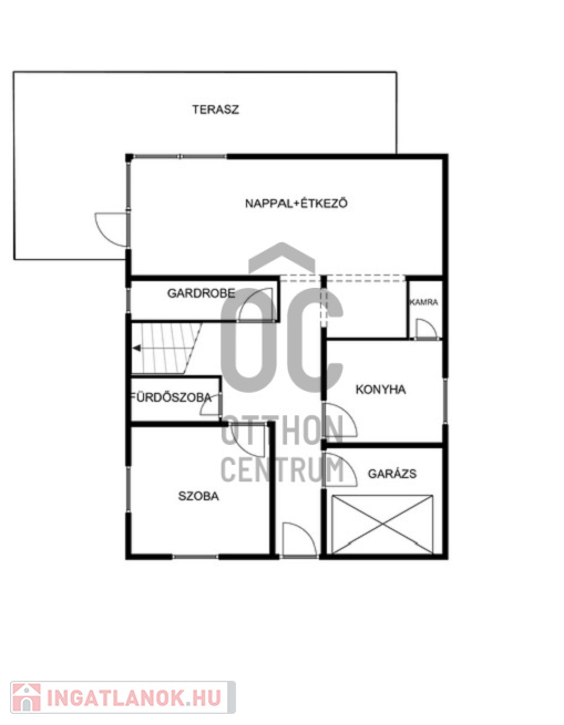 - földszinten: tágas, részben fedett terasz- és kertkapcsolattal bíró Nappali, hangulatos és működő kandalló ,fürdőszoba, kamra-konyha, pincelejáró, gardrób