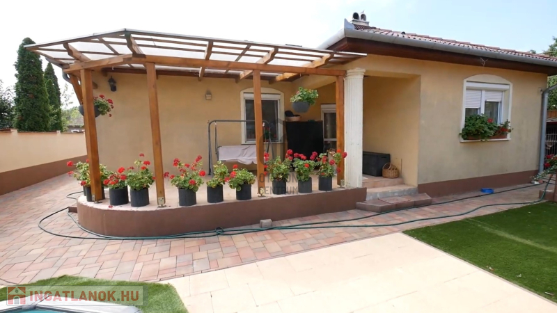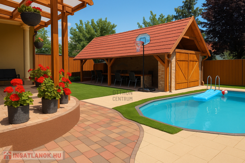 A 550 m²-es, gondosan parkosított telek igazi ékszerdoboz: a fedett teraszok, a beépített filagória, a bográcsozó és a kerti zuhanyzó tökéletes helyszínt kínálnak a családi és baráti összejövetelekhez, a saját gépészettel szerelt, fedhető 3x7 méteres medence pedig a nyári kikapcsolódás elengedhetetlen része. Az udvar műfűvel és térkővel borított, beépített tárolókkal praktikus megoldásokat nyújt, az automata öntözőrendszer pedig a virágok, évelő növények, vetemény és a termő barackfák gondozását könnyíti meg.