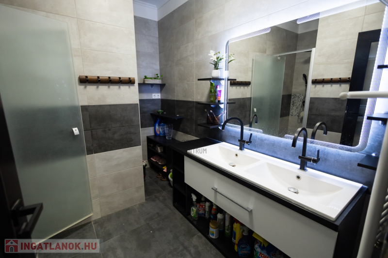 Két elegáns kialakítású fürdőszoba, valamint a lakás belső tereiben alkalmazott egyedi és kreatív design-megoldások emelik az otthon színvonalát. A jól átgondolt belsőépítészeti elemek minden szobában harmóniát és stílust sugallnak.