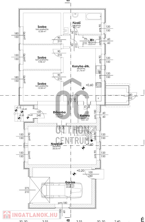 - 3 szoba: 12,58 m² + 9,98 m² + 12,58 m²