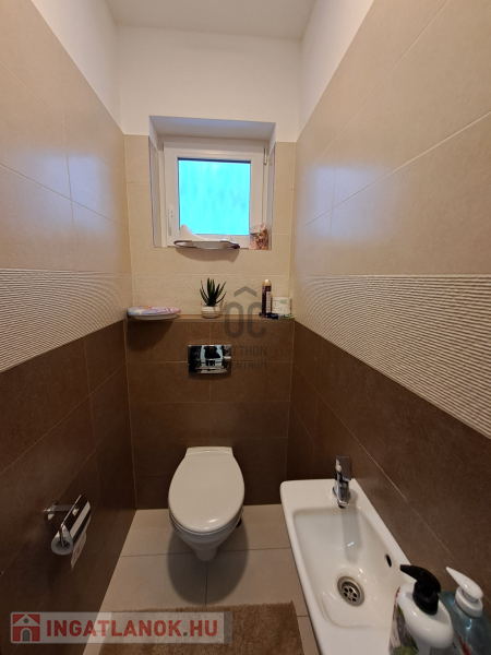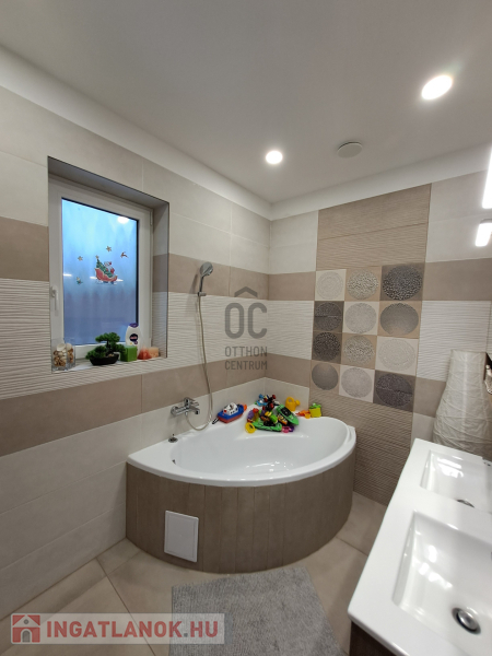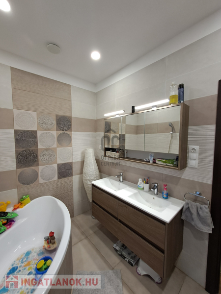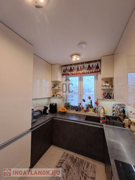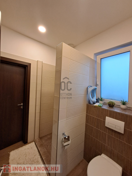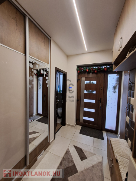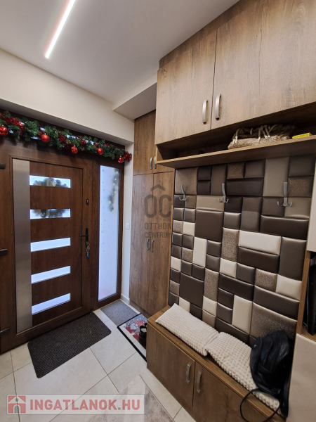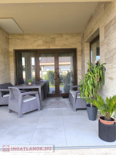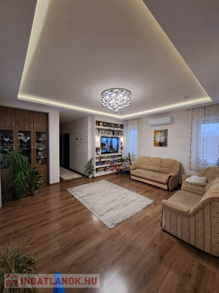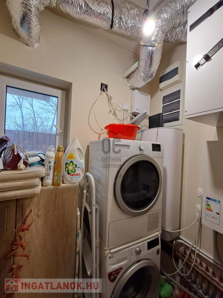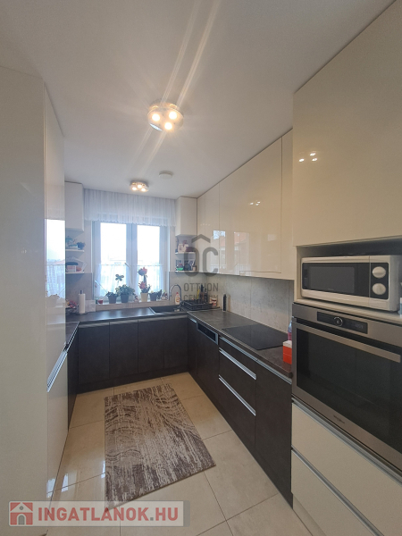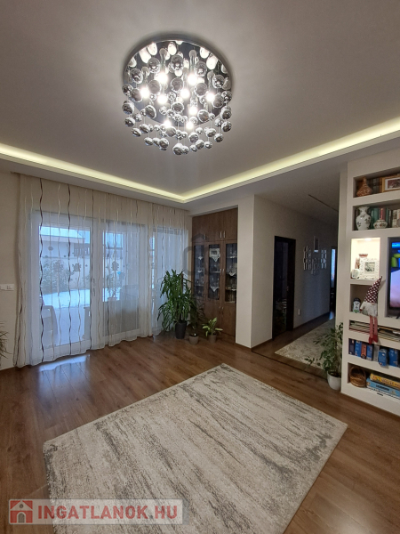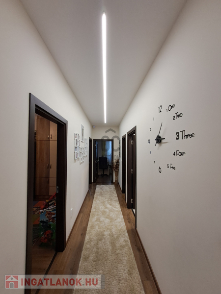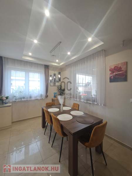 Az ingatlan amerikai konyhás, tágas, világos és modern kialakítású nappalival rendelkezik. A mennyezeti részben automata szellőztető rendszer és LED-világítás beépítésére került sor. A ház belmagassága a konyha-étkező részben 2,7 méter a többi helyiségben 2,84 méter. Az ingatlanba kiváló minőségű, többrétegű műanyag Schücco márkájú nyílászárókat, elektromos redőnyöket és központi porszívót szereltek be. Egyedi tervezésű, gépesített konyhabútor, illetve beépített szekrények lettek beépítve. A nagy belmagasság, a beépített bútorok, valamint szekrények eleganciát és praktikusságot kölcsönöznek az otthonnak.